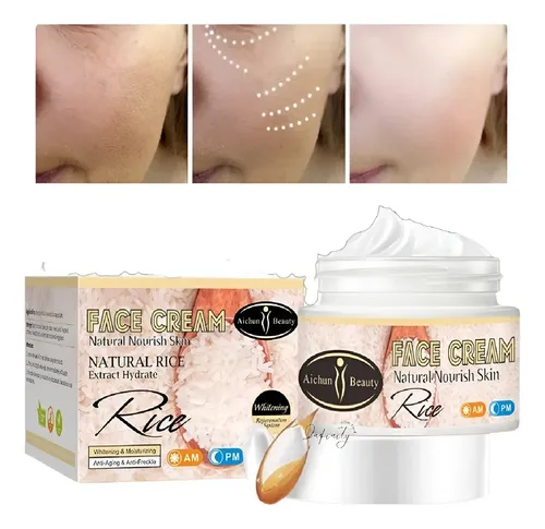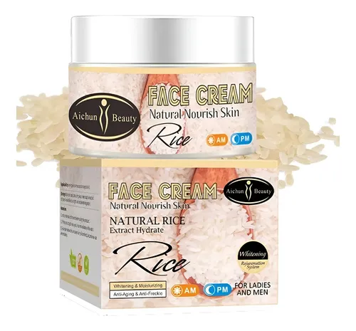 Crema facial de arroz Aichun Beauty con ingredientes naturales que suavizan su cutis con propiedades antiedad, anti manchas, hidratante, nutritiva, antioxidante y anti acné, para uso diario día y noche.