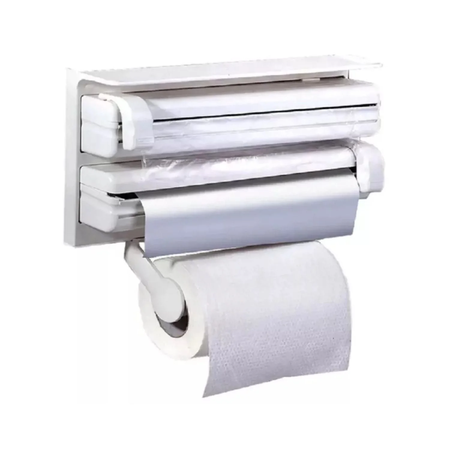 Características principales ● Un estante de almacenamiento elegante, seguro y práctico con cortadores para la cocina moderna ● Todo se almacena perfectamente en un solo lugar, equipado con cuchillas afiladas en ambos rollos para cortar la envoltura de plástico u otros ● Con la estructura de diseño ergonómico, capaz de quitar los cortadores de forma segura ● Conveniente y adecuado para guardar envoltura de plástico en la cocina