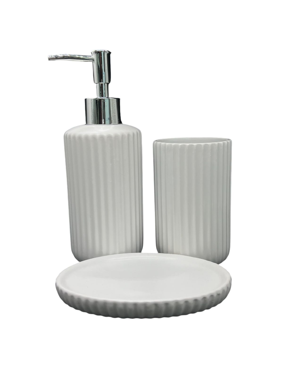 Este elegante set de baño de 3 piezas está fabricado en cerámica de alta calidad y ofrece una combinación perfecta de funcionalidad y estilo para tu baño. El set incluye un dispensador de jabón, un porta cepillo y jabonera a juego, todo diseñado para complementar la decoración de tu baño con un toque de sofisticación.